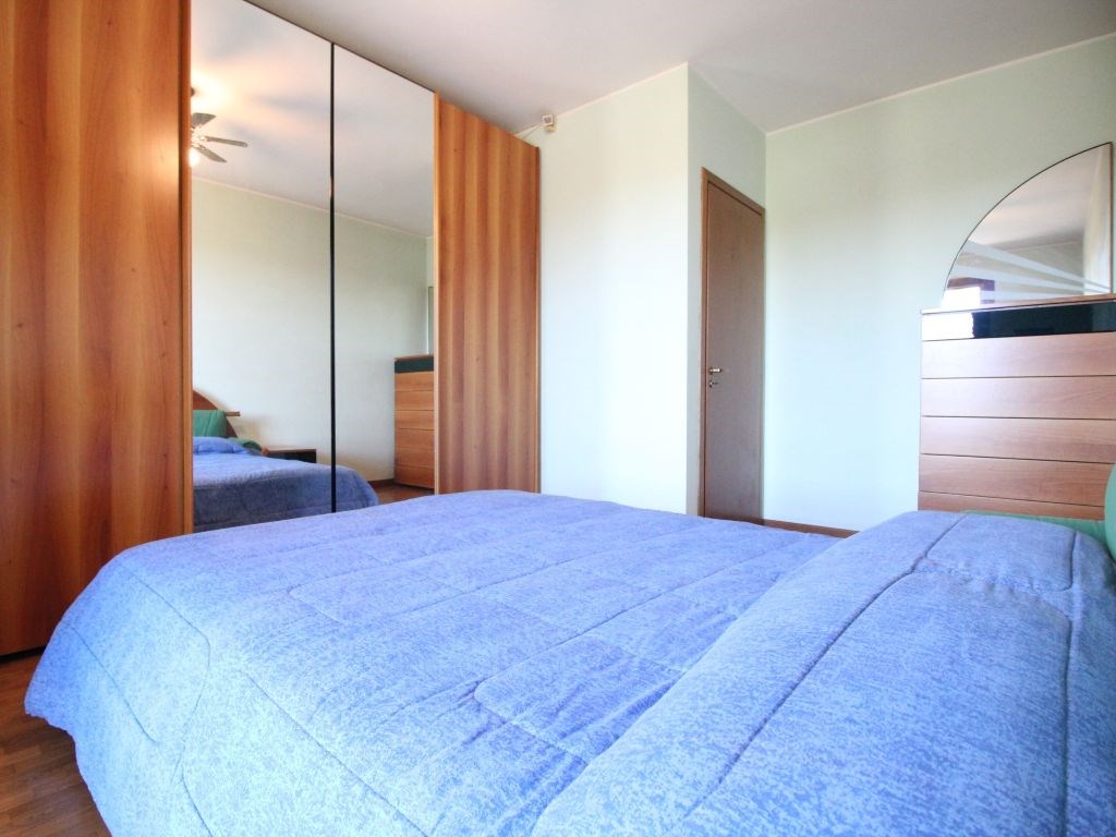 Al piano superiore, sempre di 60 mq, la camera matrimoniale si affaccia su un balcone con vista sul Resegone e le montagne di Lecco: un panorama che ogni giorno regala meraviglia.